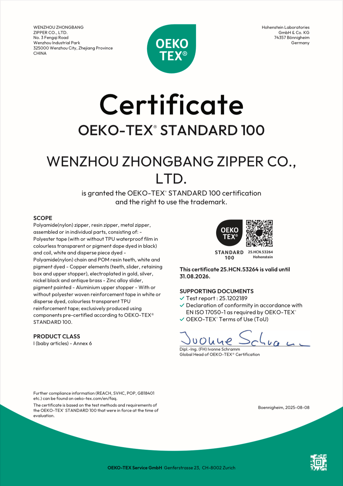 Wenzhou Zhongbang Zipper Co., LTD was founded in 1995, is a strength factory with more than 20 years of industry experience. Zhongbang zipper provides and supports customization of various metal zippers, resin zippers, nylon zippers, invisible zippers, waterproof zippers, weave nylon zipper and special zippers, nylon monofilament, sliders and zipper making machines. Over the decades, the company has been insisting on innovation and improving technology, and has now developed into a one-stop zipper manufacturer. With high quality zipper, meticulous service and timely delivery, we are now aiming at creating higher quality products. Looking forward to cooperating with you!
