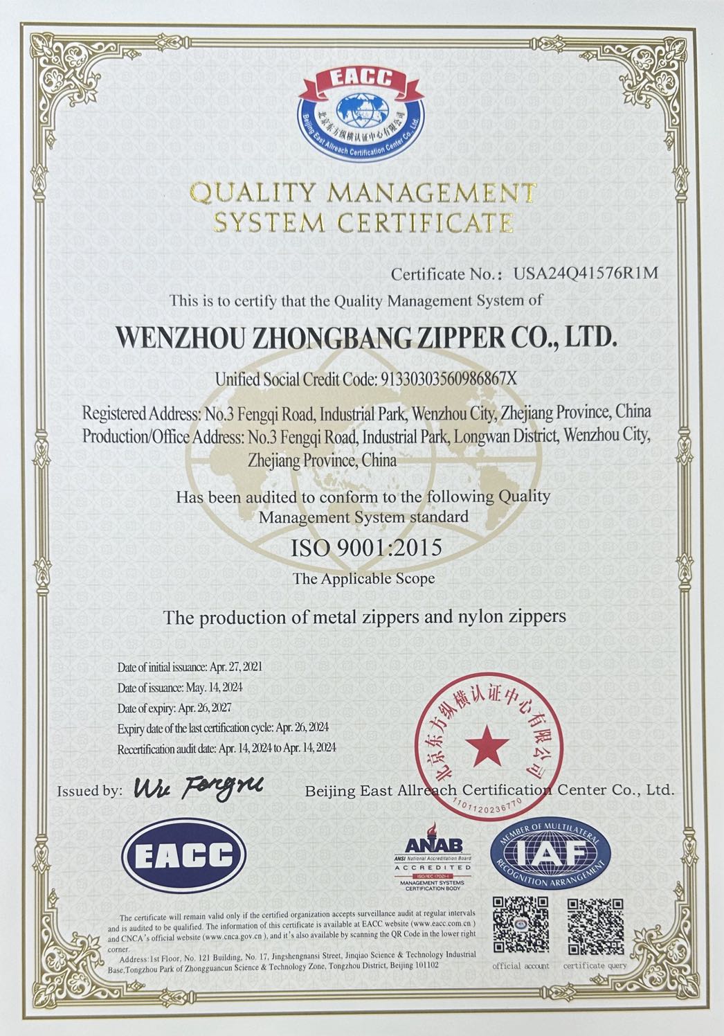 Wenzhou Zhongbang Zipper Co., LTD was founded in 1995, is a strength factory with more than 20 years of industry experience. Zhongbang zipper provides and supports customization of various metal zippers, resin zippers, nylon zippers, invisible zippers, waterproof zippers, weave nylon zipper and special zippers, nylon monofilament, sliders and zipper making machines. Over the decades, the company has been insisting on innovation and improving technology, and has now developed into a one-stop zipper manufacturer. With high quality zipper, meticulous service and timely delivery, we are now aiming at creating higher quality products. Looking forward to cooperating with you!
